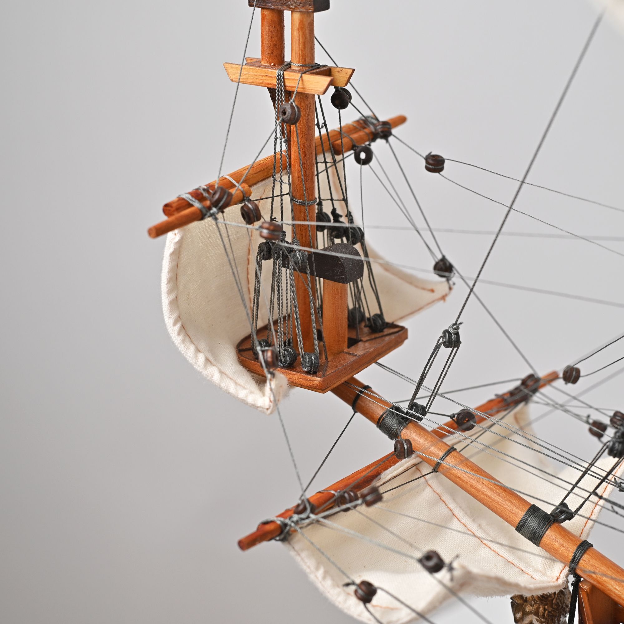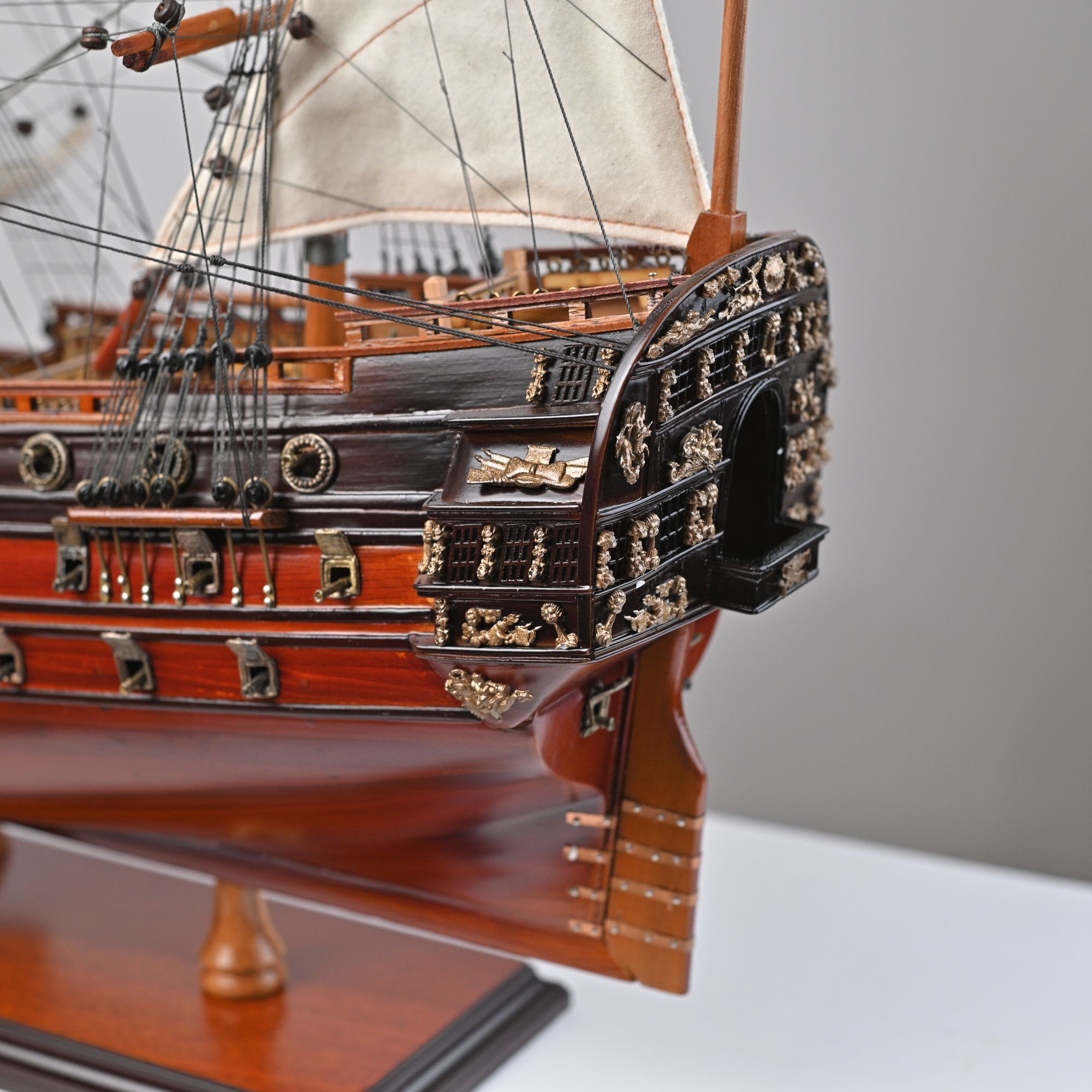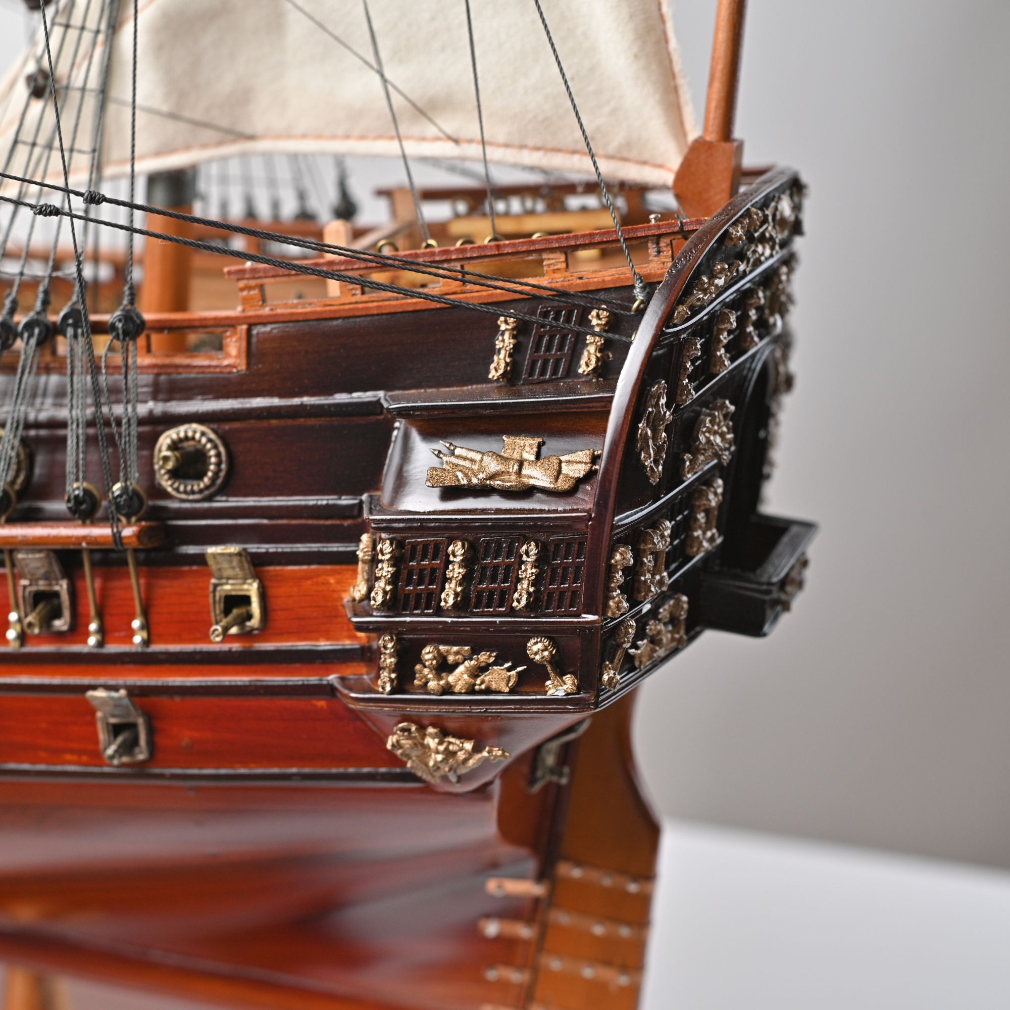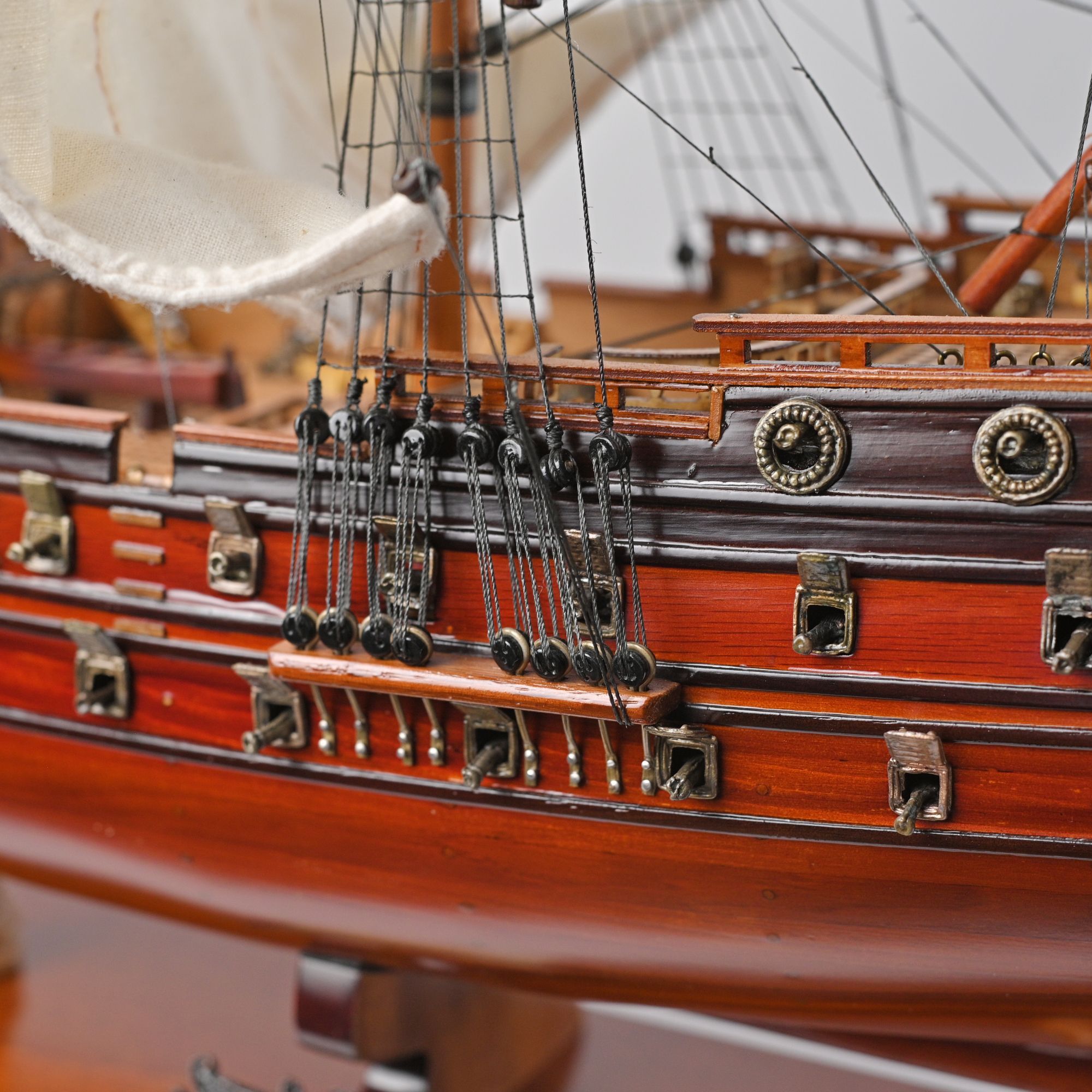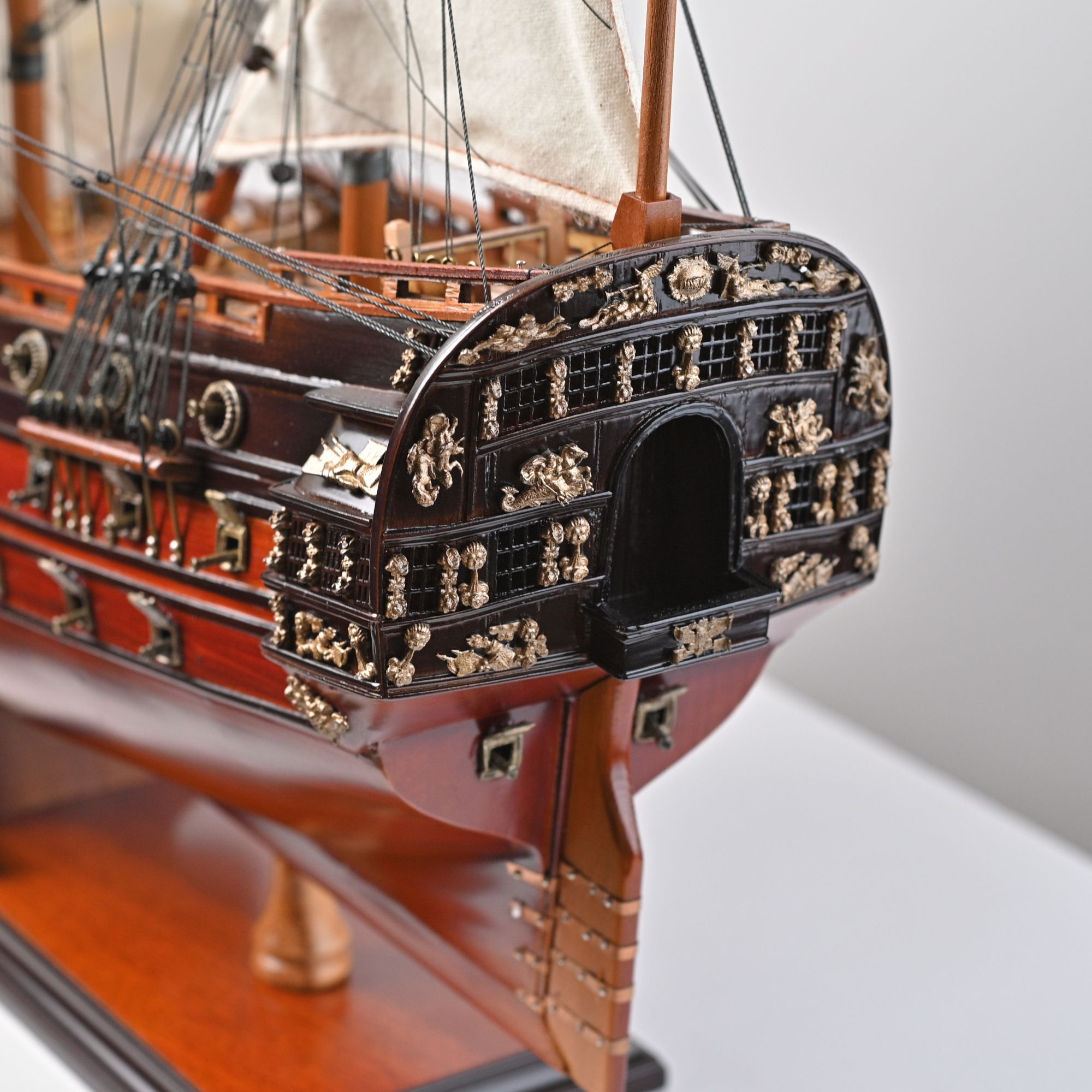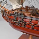 Модель корабля выполнена в масштабе по принципу сборки настоящих кораблей, используя реальные фотографии и чертежи, из высококачественных пород дерева, таких как красный красный кедр и палисандр.