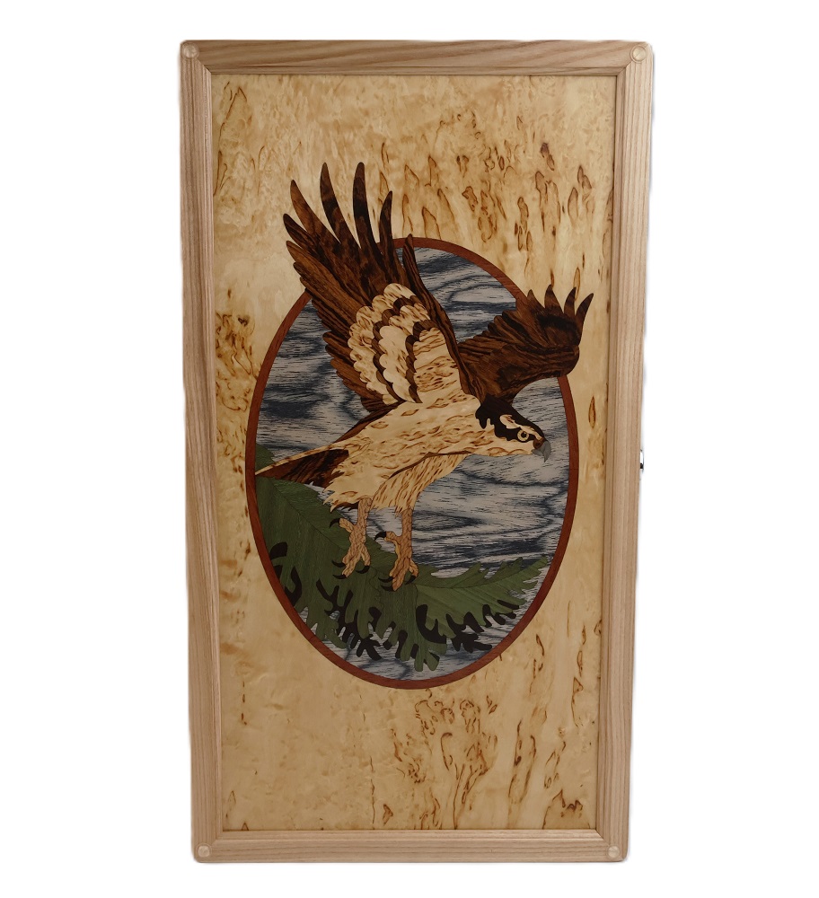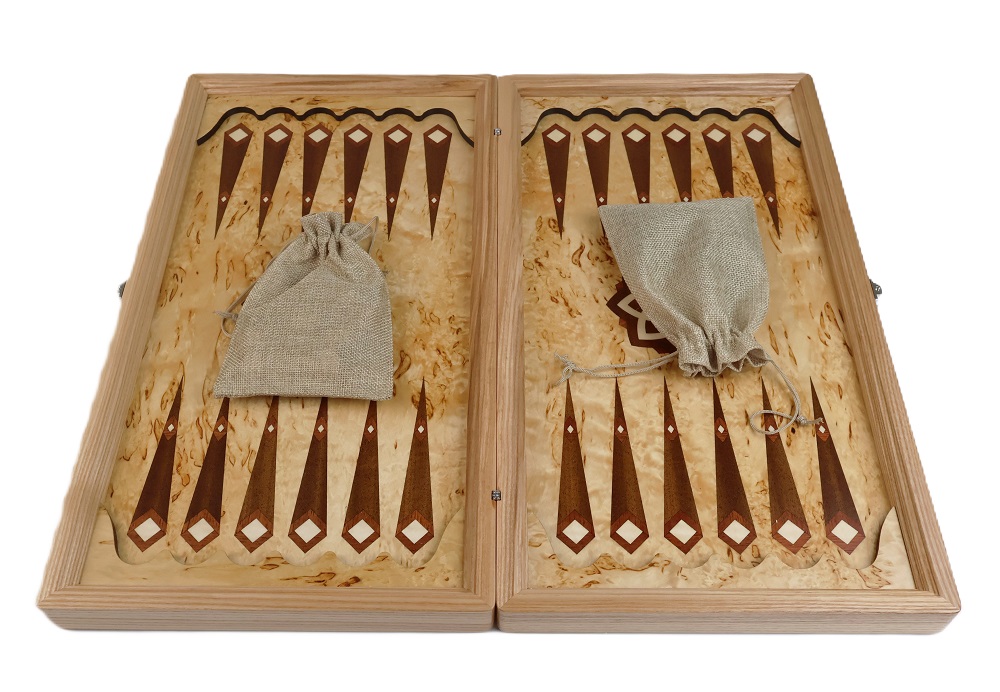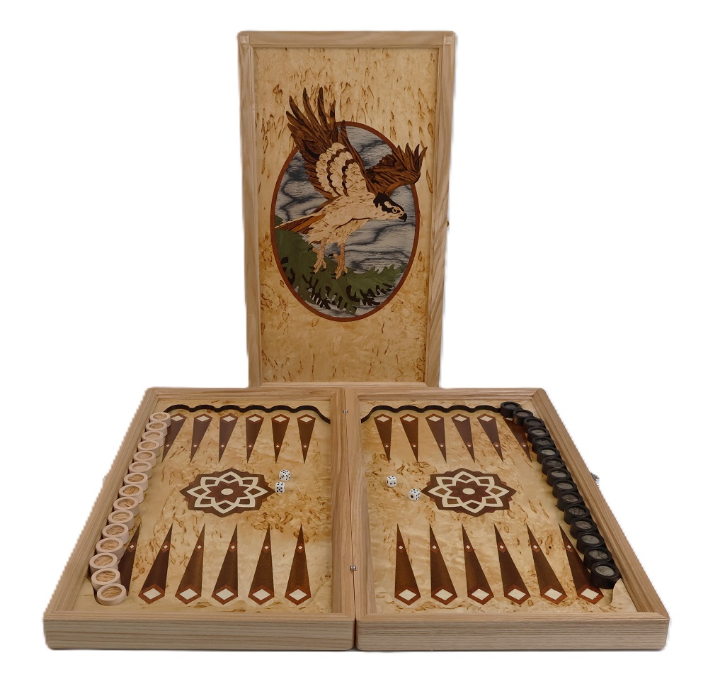 Эксклюзивные нарды Сокол выполнены из ценной породы дерева, произрастающего в России, карельской берёзы с применением техники маркетри (мозаичного узора) из ясеня, палисандра, оливкового дерева, зирикоте.