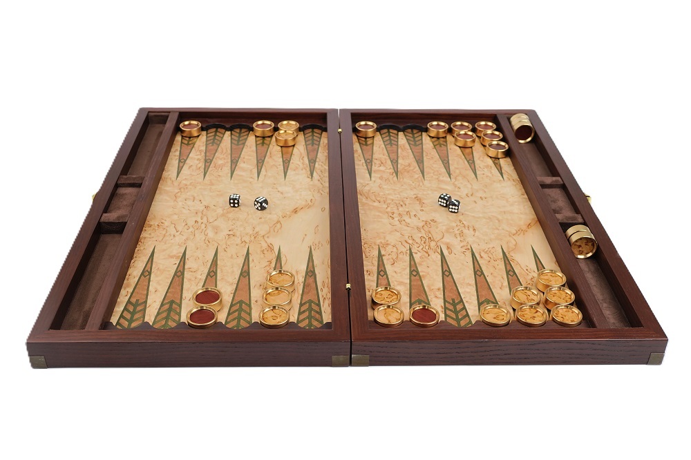 Каркас нард изготовлен из массива термообработанной древесины ясеня. Игровые поля из карельской берёзы. Мозаика собрана из ценных пород древесины. Каркас изготовлен из древесины ясеня(термоясень). Фишки — латунь с деревянными вставками.