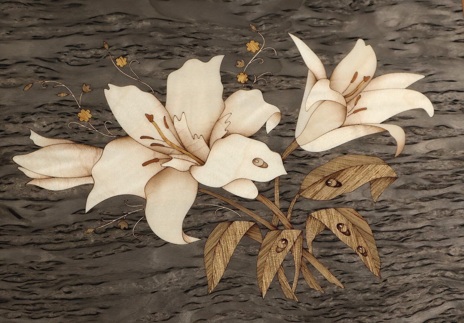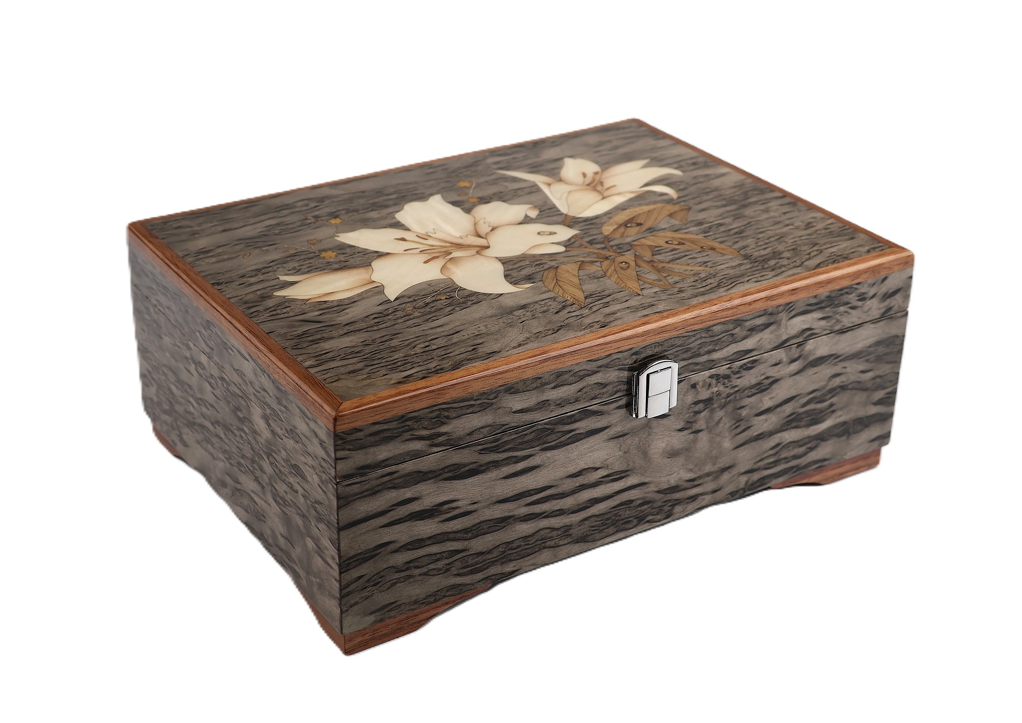 Изысканная шкатулка формата А4 выполнена из ценной породы древесины- мореной карельской березы. Рисунок в виде лилий выполнен в технике маркетри с мозаикой из экзотических пород дерева.